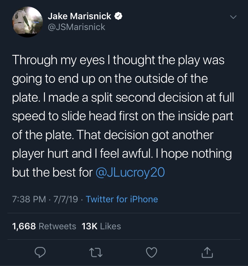 Sunday night baseball, the last hope for fans clinging to the weekend before the beginning of the dread of a work week. In a late eighth inning attempt to score Astro’s outfielder Jake Marisnick had collided with Angels’ catcher Jonathon Lucroy. With review of the play at the plate it had appeared to be that Marisnick was avoiding contact by moving to the inside of the base path. Within the same time frame an inaccurate throw home cause Lucroy to adjust to the ball to make a play on the runner. Marisnick had began is head first slide toward home plate as Lucroy performed a military tactical slide as the two met. Considering the inability to control the human body in air and the near impossible fraction of time to react, Marisnick had appeared to purposely perform the act. While some are calling for Marisnick’s head on a platter, crying out for a suspension, I feel that no such action should be taken. Does it suck for Lucroy, who was transported to hospital for a CT scan and a fractured nose? Yes. Does it suck for Marisnick, who feels he caused injury to an undeserving player? Yes. It also sucks for Major League Baseball, who is forced to make a decision that will tip toe the line of player safety and correct ruling of the play. Personally I feel that this play fits within the ruling guideline and is more of situation of unfortunate timing and placement. I don’t agree with some fan opinions that its “old school baseball” and “that players now are babied by the league.” Collisions are scary for those witnessing and especially for players who are in the collision. Giants’ catcher Buster Posey was seriosuly injured after a collision eary in his career and arguably has not been the same player since. Later, Marisnick expalined his side of story on twitter. Hopefully Marisnick did not intentionally attempt to hurt Lucroy in his action of scoring, but all we have to do is trust his word for his intent.
